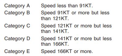 - Aircraft Approach Category (USA TERPS) : 지정된 경우 Vref 속도에 기반한 항공기 그룹 또는 Vref가 지정되지 않은 경우 최대 착륙 중량에서 Vso의 1.3배. Vref, Vso 및 최대 착륙 중량은 동록 국가의 인증 기관이 항공기에 대해 설정한 값. 항공기는 하나의 category에만 속해야 함. 만약 해당 category의 속도 범위 상한을 초과하는 속도로 조작이 이루어져야 한다면, 다음 상위 등급 category의 최솟값(minimum)을 사용해야 함. 예를 들어 category A에 속하지만 91 knots를 초과하는 속도로 circling to land 하려는 항공기는 approach category B의 minimum을 사용해 circling to land 해야 함. 범주는 다음과 같음.