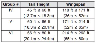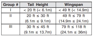- Airplane Design Group (ADG) : Wingspan과 tail height에 기초한 FAA 항공기 분류. 항공기 wingspan과 tail height가 서로 다른 그룹으로 구분된다면 더 큰 그룹이 적용됨.